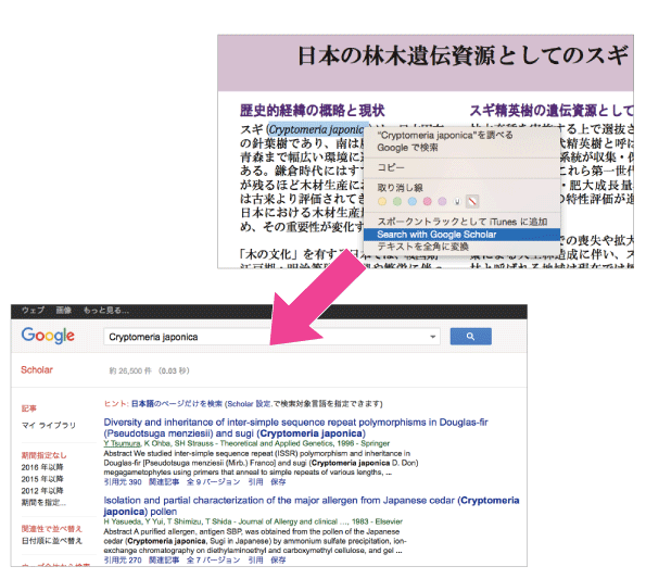 Fig. 3 illustrates an example where the botanical name of a cedar is selected in an article from the January 2016 issue of the BioResource Now! newsletter (PDF file) and the selected text is used to search using the workflow. By right-clicking on the keyword and selecting "Search with Google Scholar" from the context menu, the browser opens to show search results within Google Scholar (Fig. 4).