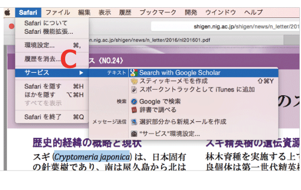 In cases where the right-click context menu does not show the "Search with Google Scholar" menu item, such as when a PDF file is displayed within a browser, you can always click on the application menu ("Safari" in the example below) and select the "Services" sub-menu (Fig. 5C).