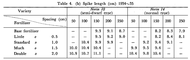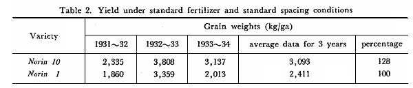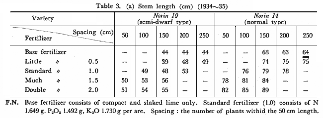 | 5) Productivity test at Iwate Agricultural Experiment Station Over the three successive crop years, 1931-32, 1932-33 and 1933-34 precision cultivation tests to ascertain the productivity of Norin 10 were carried out. According to the practice of farmers, the rows were made at a width of 60 cm and seeds were sown at a distance of 13 cm. For this experiment, a field lot with uniform soil condition was selected, and the fertilizer was given for each row equally. A seed plate with holes at a distance of 2 cm was used for making the spacing regular. Two seeds were sown in each hole, and the desired density of stands was maintained by thinning or additional planting. In this way all care was taken for the uniform growth of individual plants. ![]() The flour yield of Norin 1 ( + or - standard variety) in the crop year 1932-33 was 68%, while that of Norin 10 was 72.5%, whereas the amount of wet gluten of the former was 26.8% and that of the latter 28.2%. 6) Character test at the Iwate Agricultural Experiment Station: a) Adaptibility for conditions of cultivation - In order to obtain uniformity of soil conditions, the surface soil was first removed, the base soil was leveled, and then the well-mixed surface soil was overlaid evenly. On thus prepared field a conbination of the amount of fertilizer and spacing was designed according to the precision culture micro test method (the purpose of which was mainly to observe reaction towards nutrition and sunlight). The characteristics connected closely to yield were then tested. The following tables show the comparisons of the respective characters between Norin 10 (semi-dwarf type) and Norin 14 (normal type), both being derived from Turkey red x Fultz-Daruma. ![]() ![]() Average number of kernels on one spike was 19-28 for Norin 14 (normal type) and 21-31 for Norin 10 (semi-dwarf type), while the 1,000 kernel weight for the former was 31-35.8 g and for the later 24.8-34.6 g, especially Norin 10 in case of much fertilizer and dense planting, the kernel weight became lower due to an outbreak of powdery mildew. |