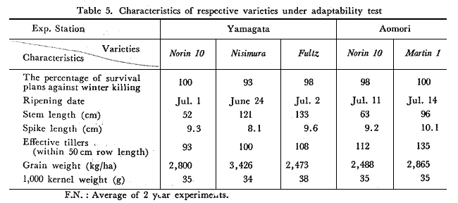 | b) Cold and snow resistance tests - Tests were made as the to percentage of survival plants and survival stems in the swelled seed beds with 100 plants of strains following F3. The cold and snow resistance of Norin 10 was stronger than either the local varieties or Norin 1, but it could not be said that Norin 10 is perfectly safe in the Tohoku district. c) Reaction to diseases - Yellow rust and leaf rust appeared to some extent every year, but any difference was noticed according to conditions of culture. There was, however, a serious outbreak of yellow rust in the spring of 1933 and of leaf rust in the spring of 1936. Norin 10 showed as high resistance as almost immune against yellow rust, but was damaged slightly by leaf rust. Powdery mildew and red mould appeared in the years with moist climate just at the time when kernels were filling in. In Norin 10 it was observed that a serious outbreak occurred in the case of application of much fertilizer and dense planting, although the damage from red mould was fairly low. d) Seed germination on spikes by rain fall - In a variety with a short dormant period seeds tends to germinate on the spikes, while they are still standing, when there is much rain fall during the harvest time. Since Norin 10 exhibited an intermediate dormancy character, it could not be said that this variety is safe if there is much rain during the harvest time. e) Grade of winter habit - The grade of winter habit is usually divided into classes from I to VII in Japan. Classes I and II are spring wheat and are suited for southwestern moderate climates. The rests possess winter habits, among which classes III and IV are suited for autumn sowing in Kanto district, classes V and VI for Tohoku district and classes VI and VII for Hokkaido. Norin 10 was found to belong to class IV, while Fultz belonged to V. 7) Ecological adaptability tests: Adaptability of Norin 10 were made in the 1932-33 and the 1933-34 crop years at five Agricultural Experiment Stations or Branch Stations in the Perfectures of Aomori, Akita, Yamagata and Fukushima. Due to wrong handling of seeds in the 1933-34 year test, poor germination was caused and uneven test results were obtained. Therefore, some of the odd results are not given in the table. 8) Norin 10 and local varieties in Iwate and Yamagata Prefectures: In Iwate Prefecture local varieties had been those obtained by pure line selection of endemic varieties like Shisen 1 and Soshu 1 and of an introduced variety like Fultz 1, but in 1929 these varieties were replaced by the recommended varieties Norin 1 and Norin 2 (Shiro-Daruma x Velvet), while, Norin 10 became the recommended variety in 1935. In l942 31% of the wheat cultivation area in Iwate Perfecture was occupied by Norin 10. After that, however, there was a gradual decrease of this variety, and in 1953 it was replaced by Kokeshi-komugi. As compared with Norin 10, Kokeshi-komugi had higher cold and snow resistance, and therefore it gave more tillers and higher yield, especially in case of much fertilizer. ![]() |