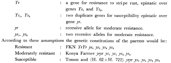 H. A. MOHAMED, A. M. OMAR, A. K. A. SELIM and M. N. El-BARHAMTOUSHY Faculty of Agriculture, Ain Shams University and Bahrim Experiment Station, Cairo, Egypt I. Stripe rust Inheritance of mature plant reaction to stripe rust of wheat was studied in six crosses making a dial between the four vulgare wheat cultivars Tosson, (Hindi 62 x Hindi 722), Kenya Farmer and F.K.N. These studies were carried out in season 1967-68 on F1, F2 populations and backcrosses where the epiphytotic of the natural infection during this season was severe. According to mature plant reaction to stripe rust, the cultivars were classified in these classes -. ; Resistant : F.K.N. Moderately resistant : Kenya Farmer Susceptible : Tosson and (Hindi 62 x Hindi 722) Crosses studied were grouped in four groups: (1) Moderately resistant x susceptible crosses: This group was represented by two crosses, including Kenya Farmer as a moderately resistant parent crossed with each of the two susceptible cultivars Tosson and (H. 62 x H. 722). F1 of each cross was nearly as susceptible as the susceptible parents, showing nearly complete dominance of susceptibility to stripe rust. From these results, it could be suggested the presence of two duplicate genes (Ys1 and Ys2) for susceptibility carried by the susceptible cultivars Tosson and (H. 62 x H. 722) respectively, while their recessive alleles (ys1 and ys2 were carried by the moderately resistant Keyna Farmer cultivar. (2) Resistant x Susceptible crosses: This group was represented by two crosses including FKN as a resistant parent crossed with the susceptible cultivars Tosson and (H. 62 x H. 722). The F1 plants showed resistance to stripe rust (type 1), indicating incomplete dominance of resistance. Data indicated that resistance to stripe rust was due to the presence of three pairs of gene difference between the parents, and suggesting that the resistant parent carried one dominant gene for resistance. The resistant cultivar FKN might carry the dominant gene (Yr) for resistance, while for the two susceptible cultivars Tosson and (H. 62 x H. 722), it was suggested previously that they carried the two dominant duplicate genes for susceptibility (Ys1 and Ys2) respectively. Gene (Yr) for resistance was epistatic to genes Ys1 and Ys2 for susceptibility. (3) Resistant x moderately resistant crosses: This group was represented by the cross FKN x Kenya Farmer. All F1 plants showed resistance to stripe rust (Type 0) as in FKN parent, indicating complete dominance of resistance. Results indicated the presence of one pair of genes controlling resistance to stripe rust. The cultivar FKN was suggested to carry the dominant gene (Yr) for resistance, while the moderately resistant cultivar Kenya Farmer carried the recessive allele (yr). (4) Susceptible x susceptible crosses: One cross between the two susceptible parents Tosson and (H. 62 x H. 722), represented this group. The F1 plants, F2 population and progenies of backcrosses were all susceptible as the parents. It was previously suggested that the two duplicate genes for susceptibility (Ys1 and Ys2) respectively are found in the two parents. This conclusion agreed also with the results obtained in this group of crosses. To explain the previous results, obtained from the F1, F2 and backcrosses of these four groups of crosses on a factorial basis, the following genes were suggested: ![]() |