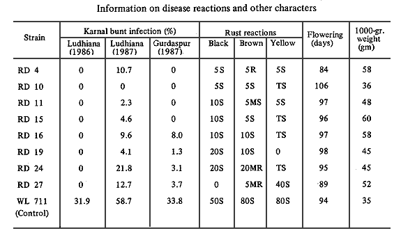 M.K. UPADHYAY and B. SINGH Division of Genetics, Indian Agricultural Research Institute, New Delhi, India With the extensive cultivation of semidwarf wheats in India a hitherto minor disease karnal bunt caused by Neovossia indica (Mitra) Mundkar assumed serious proportions. Besides causing yield losses the pathogen imparts fishy odour to the wheat flour and makes it unfit for human consumption. As confirmed sources of genetic resistance to karnal bunt are not yet available (SINGH et al. 1986), 30 strains of macaroni wheat were screened against the disease under artificial conditions of infection at Ludhiana during 1986 season. Out of these, eight strains showed immune reaction (no infection) to the desease (UPADHYAY & SINGH 1987). These eight strains were again screened against the disease under artificial infection at Ludhiana and Gurdaspur in 1987. Information on their reaction to karnal bunt, rusts (under multilocational 'hot spot' testing), flowering and thousand grain weight is given below. ![]() The data shows that WL 711, the susceptible check variety, showed heavy infection of karnal bunt ranging from 31.9 to 58.7 percent indicating thereby that conditions were favourable for the development of the disease. RD 10 was the only strain showing immune reaction to the disease at both the locations. RD 10 is a semidwarf macaroni wheat, medium late in maturity having amber and hard grains. The strain also possesses fair degree of resistance to rusts. Thus RD 10 appears to be an excellent source of genetic resistance to karnal bunt which can be profitably used for incorporation of resistance to the disease into Indian wheat cultivars. The authors are grateful to Dr. L.B. GOEL, Principal Investigator (Wheat Pathology), I.A.R.I., New Delhi for getting the material screened against karnal bunt. References SINGH, S., L.B. GOEL & V.C. SINHA. 1986. Fungal diseases and their management. In Twenty-five years of Coordinated Wheat Research (1961 - 86). p. 127-157 (India) UPADHYAY, M.K. & B. SINGH. 1987. Karnal bunt resistance in triticale and macaroni wheat. Annual Wheat Newsletter, Vol. 33 p. 60 |