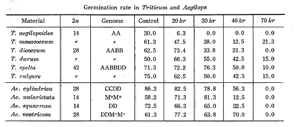 T. FUJII National Institute of Genetics, Misima, Japan Differences of sensitivity between di-, tetra- and hexaploid plants were compared in several species and varieties of Triticum and Aegilops. Dry dormant seeds were used for this examination which were irradiated from 20 to 70 kr by gamma-ray. Radiosensitivity was determined by the decrease of germination rate and the average length of the seedlings. Genus Aegilops showed more tolerance to radiation than genus Triticum. In tetraploid species of Aegilops the germination rate remained even at 40 kr, compared with that of the control, while that of the tetraploid Triticum dicoccum showed a marked decrease at 30 kr. A part of the results is shown in the table. ![]() Diploid species of Triticum and Aegilops were most sensitive to radiation, and the hexaploid Triticum species were not more resistant than the tetraploid ones. Differences of sensitivity were also observed in different varieties (or species) of a species (or group). These facts show that radio-sensitivity depends not only on the kind and number of genomes but also on the kind of alleles present. |