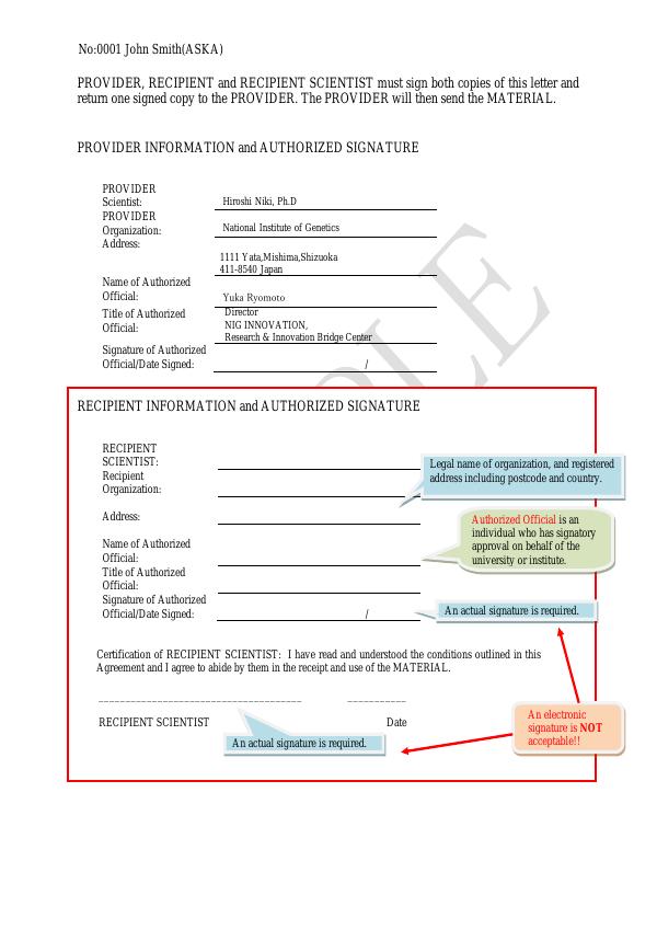 • MTAに関するお問い合わせは TEL: 055-981-5835(国立遺伝学研究所 産学連携・知的財産室)までご連絡下さい。