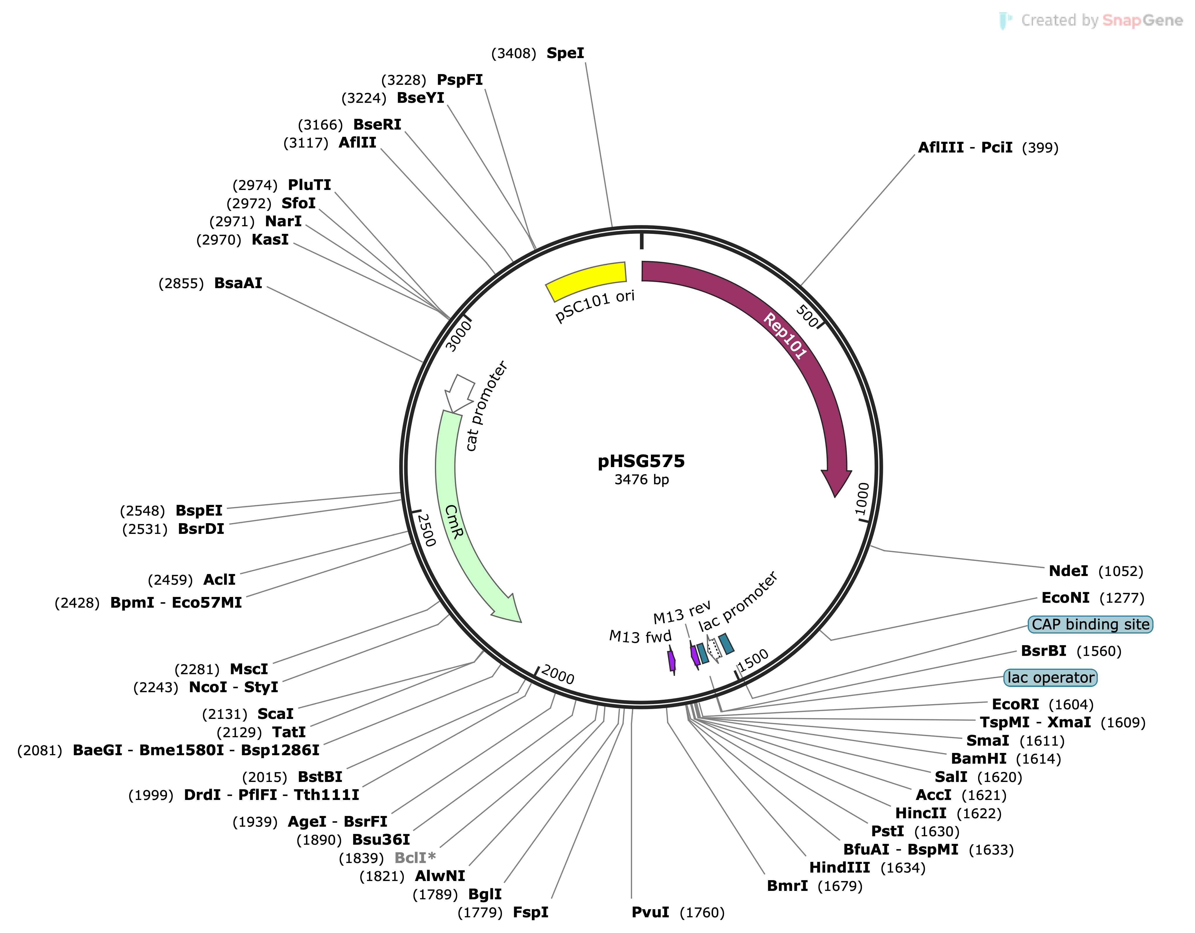pHSG575 | pSC101 | 3.476 | Low Copy Number | cml | pHSG575 Map.png |