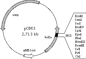 pOM3 | pMB1 | 2.713 | General | amp | pOM3.gif | Accession No. L08939 | |