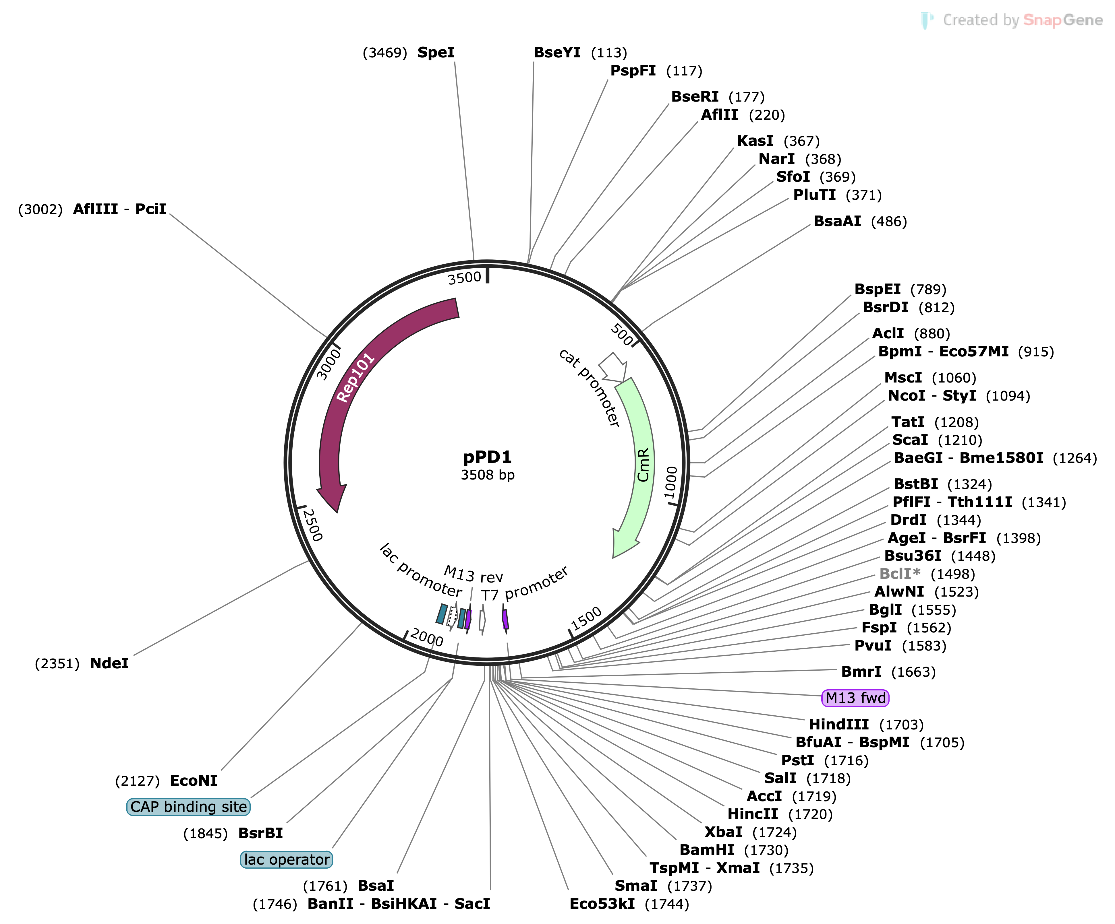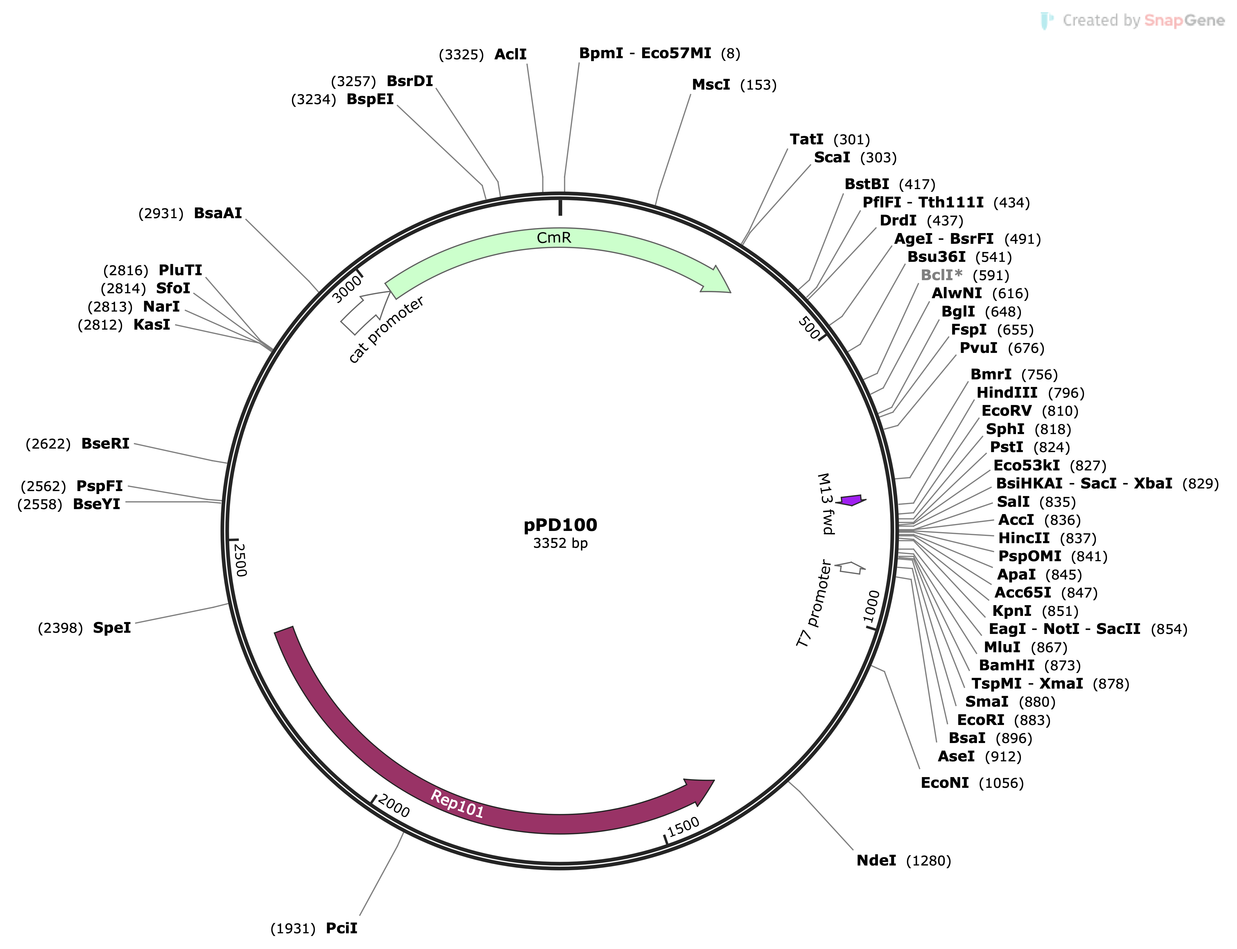 | pPD100 | pSC101 | 3.352 | Low Copy Number | cml | pPD100 Map.png |