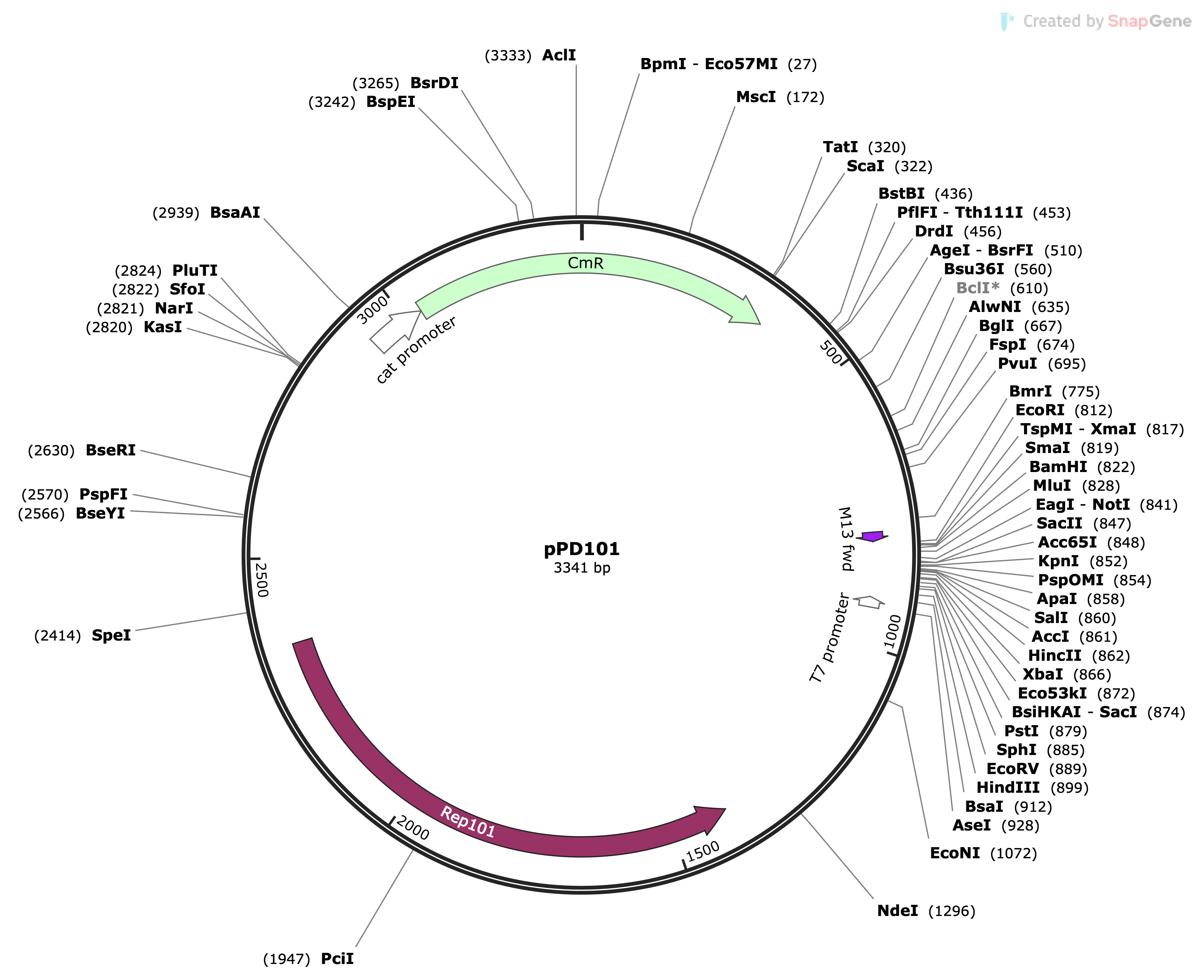 | pPD101 | pSC101 | 3.341 | Low Copy Number | cml | pPD101 Map.png |