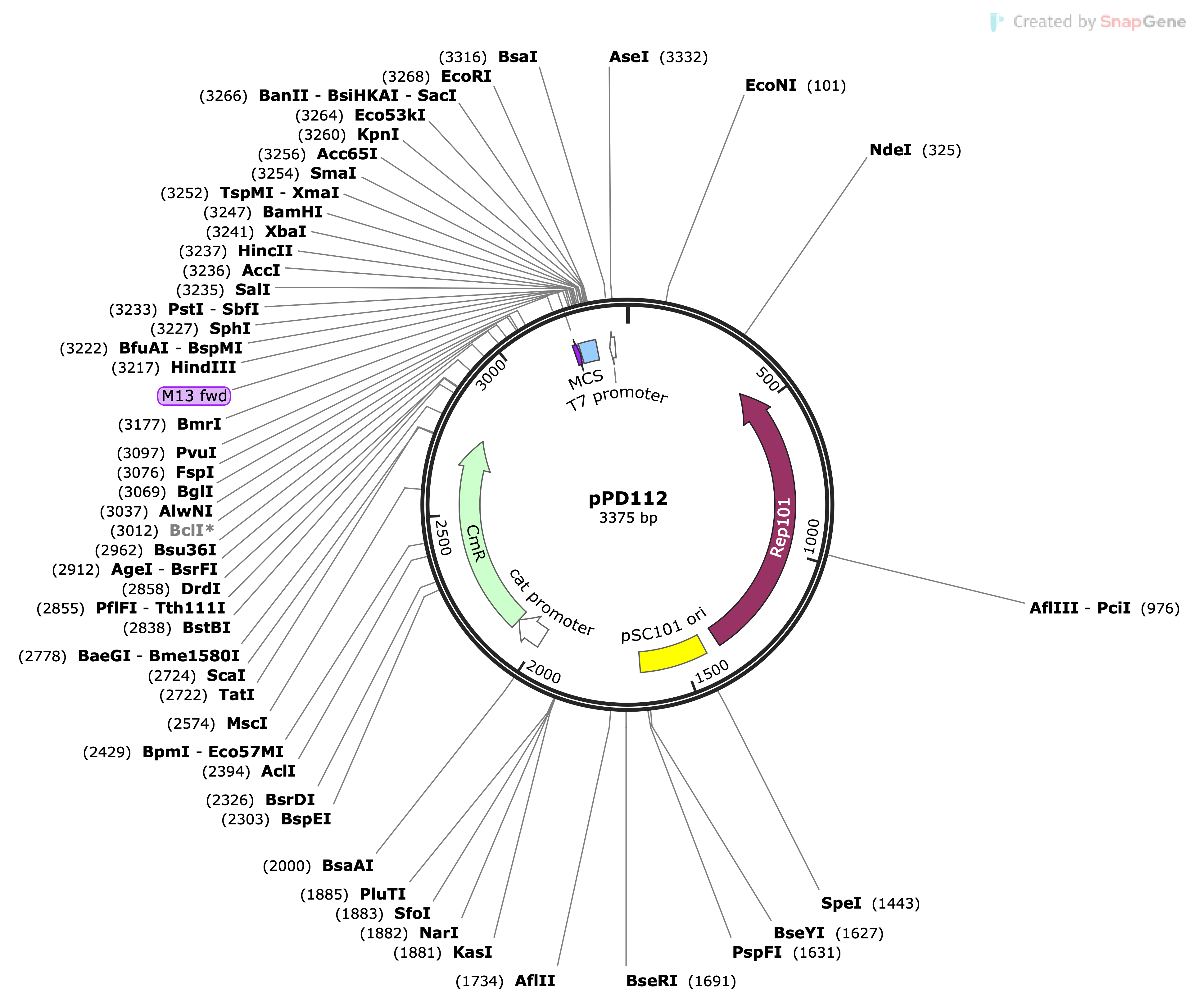 | pPD112 | pSC101 | 3.375 | Low Copy Number | cml | pPD112 Map.png |