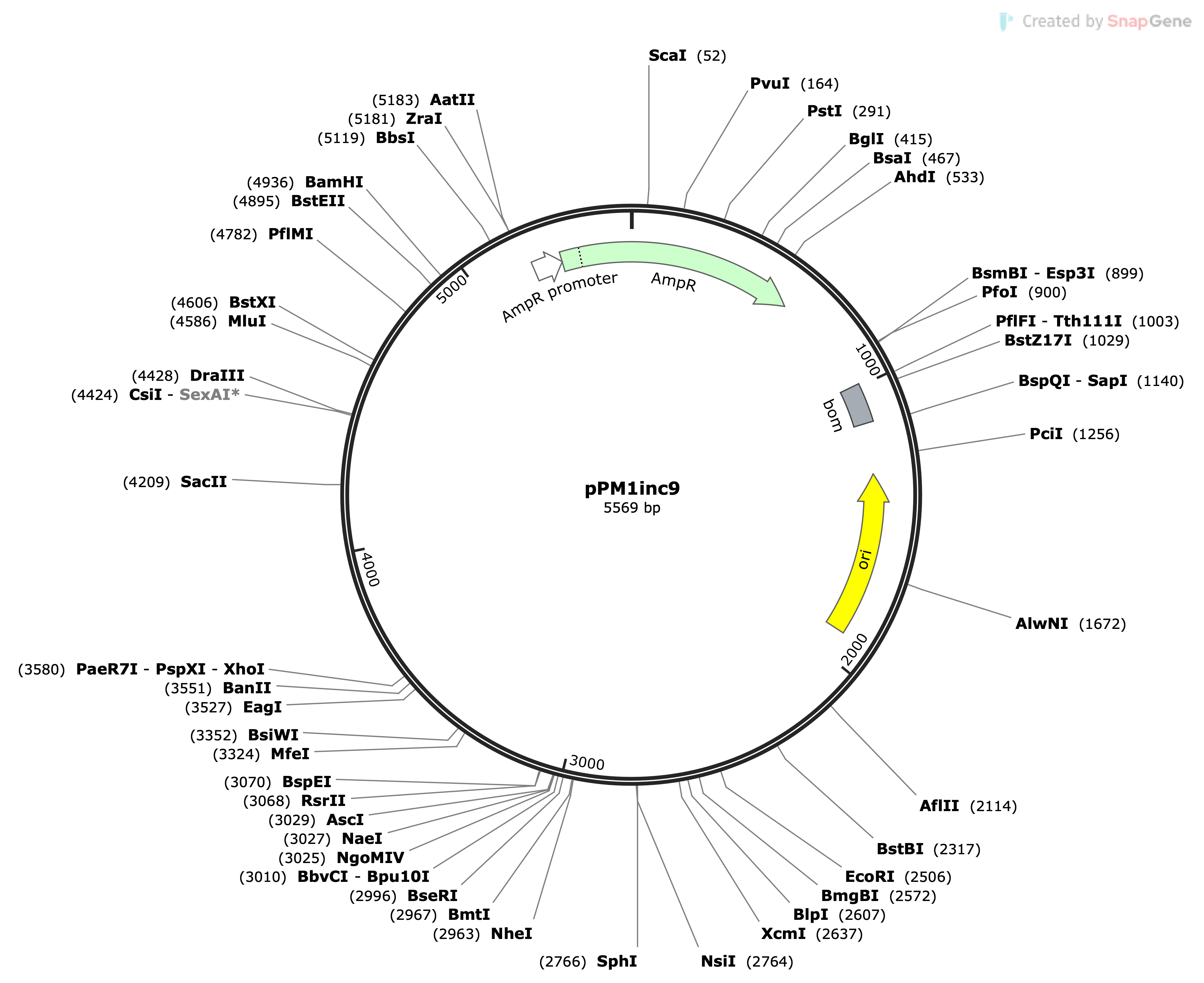| pPM1inc9 | pSF1050 | 5.569 | High Copy Number | amp | pPM1inc9 Map.png |