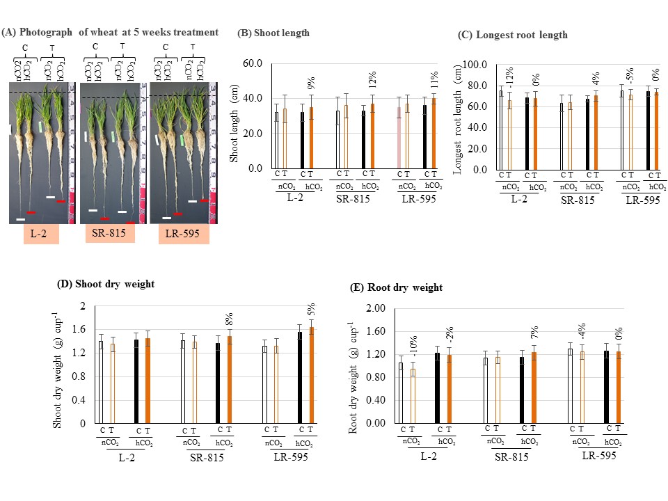 Figure 2. Effect of high CO2 on root and shoot growth. (A) Comparison on morphology of Lalmi-2, SR-815 and LR-595 for different doses of CO2. (B) Shoot length (cm). (C) Longest root length (cm). (D) Shoot dry weight (g). (E) Whole root dry weight (g). Values represent the mean ± SE (n=10). Percentages indicate the rate of changes due to the control and CaCO3 treatments. n, normal CO2 condition (400-500 ppm); h, high CO2 condition (800-1000 ppm).
