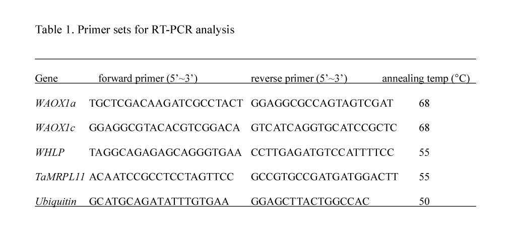 Two common wheat (Triticum aestivum L.) cultivars, Chinese Spring (CS) and Mironovskaya 808 (M808), were used in this study. No significant difference of dehydration tolerance was observed between CS and M808 (Egawa et al. 2006). For H2O2 detection, 3-3’-diaminobenzidine tetrahydrochloride (DAB) (Wako, Osaka, Japan) was used, and leaf samples were infiltrated in 2% mg ml-1 DAB solution (pH3.8) for 8 hours. The infiltrated leaves were then treated with 100% ethanol for chlorophyll removal. For gene expression study, RT-PCR analysis was conducted. Total RNA isolation and the first strand cDNA synthesis were performed referred to Egawa et al. (2006). The gene-specific primer sets are listed on Table 1. Advantage 2 polymerase mix (BD Biosciences, San Jose, CA, USA) was used only for the WAOX1a and WAOX1c amplification. The PCR condition for WAOX1a and WAOX1c was demonstrated according to Sugie et al. (2007), and 30 cycles of PCR were performed in the exponential range of amplification. The wheat ubiquitin gene was used as an internal control. The PCR-amplified products were fractionated by electrophoresis through a 1.5% agarose gel and stained with ethidium bromide.