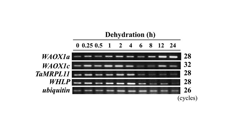 Figure 2. Comparative gene expression analysis of four mitochondrial protein genes in seedling leaves of CS under dehydration stress. Transcript accumulation levels of the AOX genes (WAOX1a and WAOX1c) and mitochondrial ribosomal protein genes (TaMRPL11 and WHLP) were analyzed by RT-PCR analysis. Cycle numbers of PCR are indicated on the right sides of electrophoregrams. As an internal control, a fragment of the wheat ubiquitin gene was amplified.