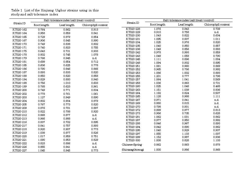 Salt stress is one of the crucial problems in irrigated fields, because excess salt affects plant growth and reduces agricultural crop production. Therefore, the mechanisms of salt response or salt tolerance have been studied using biological and genetic approaches. Recently, it was shown that some signaling pathways of salt stress share features with those of drought stress (review; Zhu 2002). Wheat is an important crop and the damages inflicted by salt stress pose an enormous problem worldwide, especially in arid regions. We expected to discover a strain that is highly resistant to salt stress as well as to drought stress in the Xinjiang Uighur landrace, because Xinjiang Uighur has a semi-arid or desert climate area, which means that the landrace is growing under drought conditions. In this study, we assessed the potential of salt tolerance in landrace strains from Xinjiang Uighur by using a hydroponic growth system.