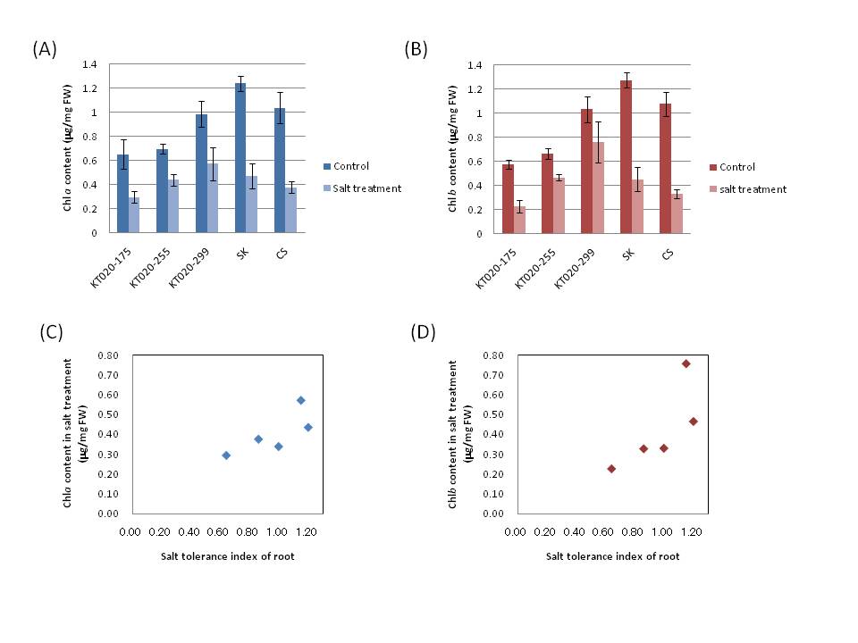 (B) Chlorophyll b content of control and salt-treatment in selected strains