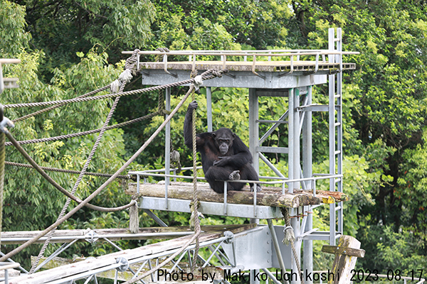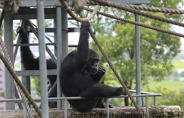 パルが下にいる個体に対して、ワイヤーを揺らしたり、ワイヤーからロープへ跳び移ったりしています。2006.4.29